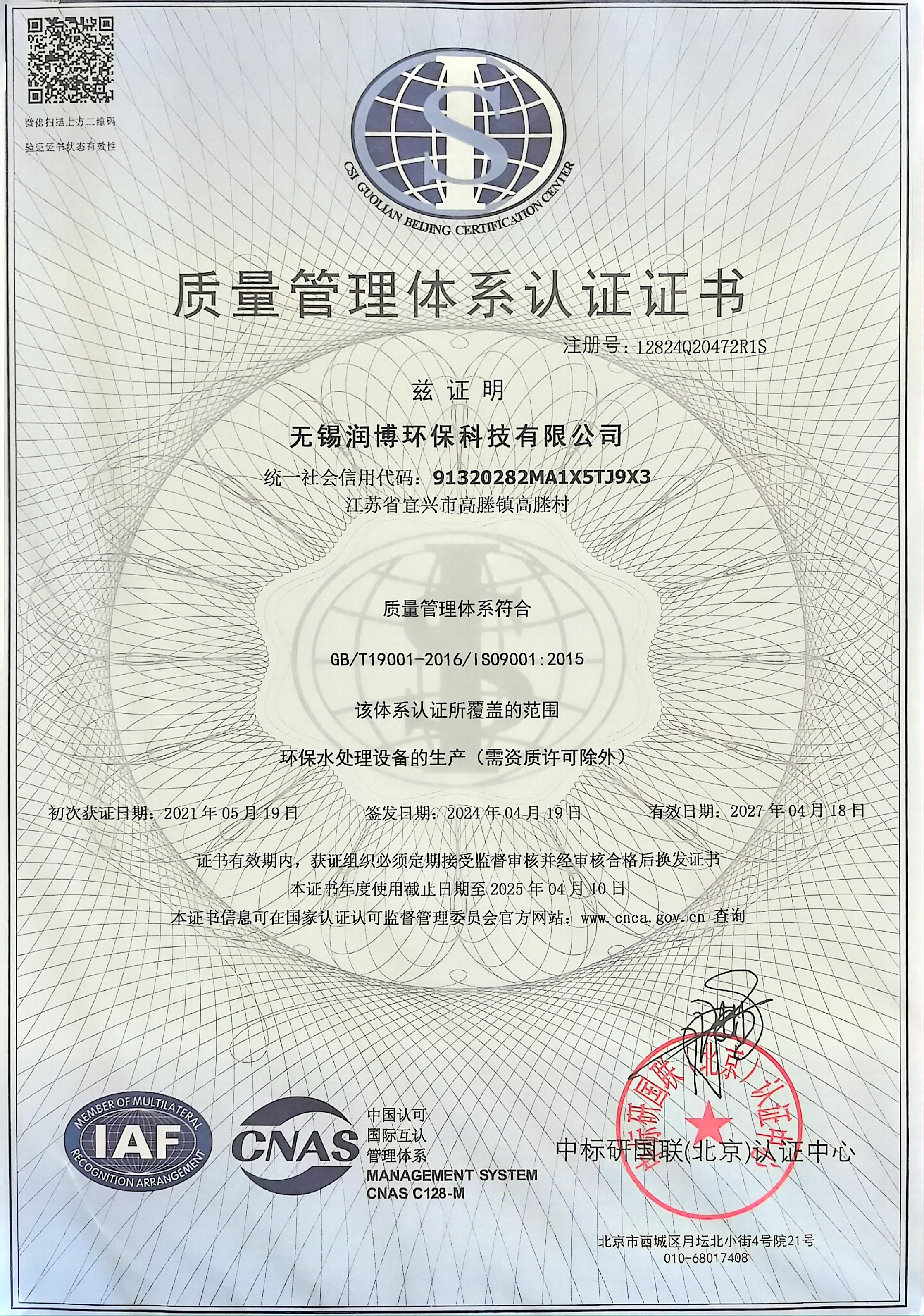 質量管理(lǐ)體(tǐ)系認證證書(shū)